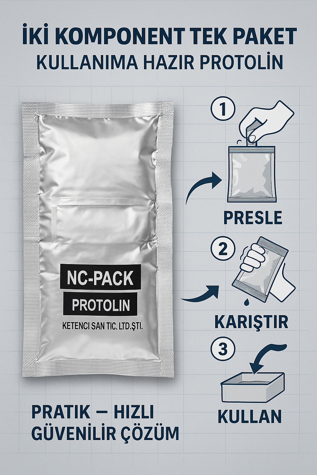 NCpack özel ambalaj yapısı sayesinde A ve B bileşenleri kullanım anına kadar ayrı tutulur. Uygulama sırasında paket içinde kontrollü şekilde karıştırılarak temiz, pratik ve güvenli kullanım sağlar.